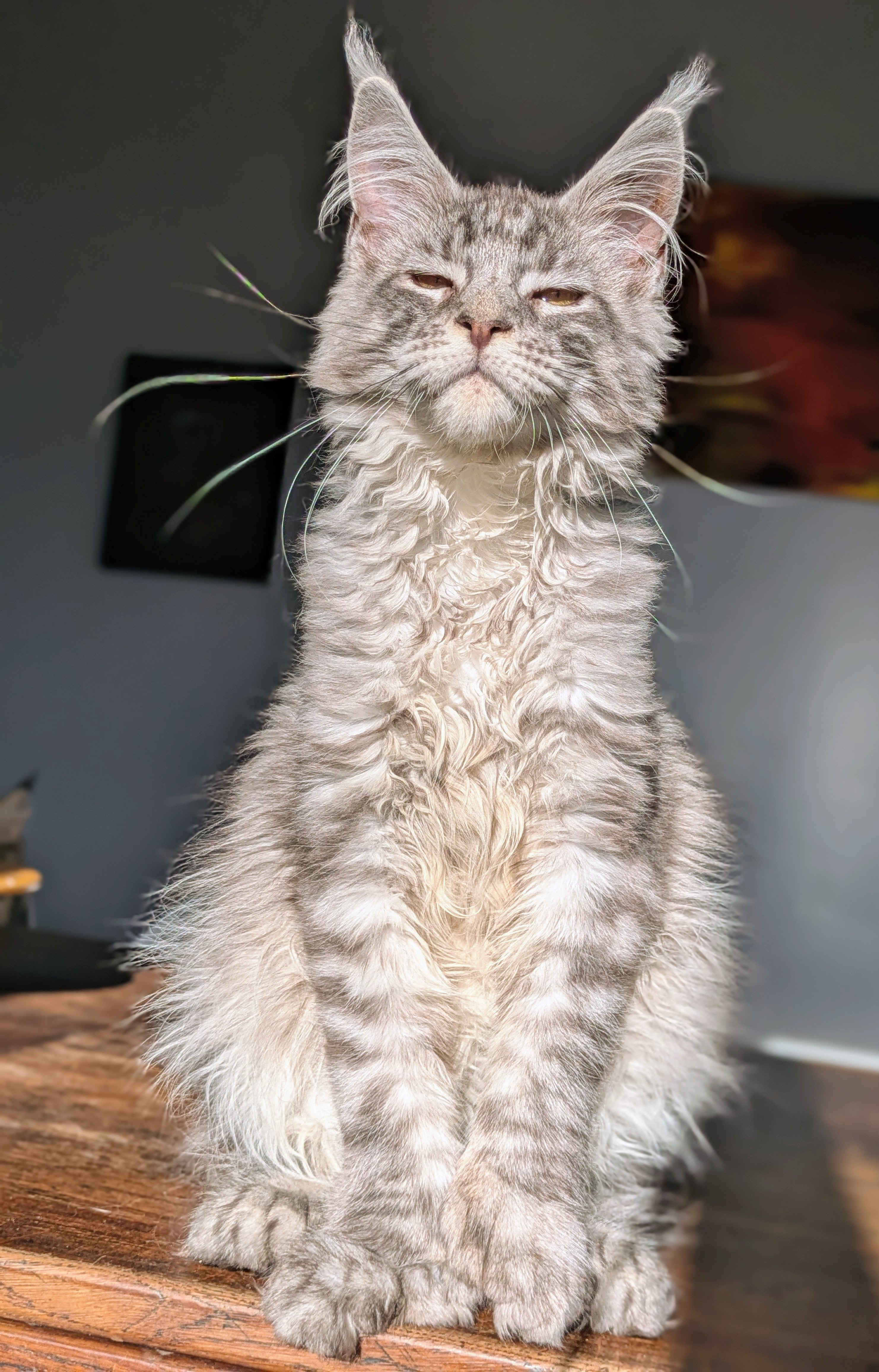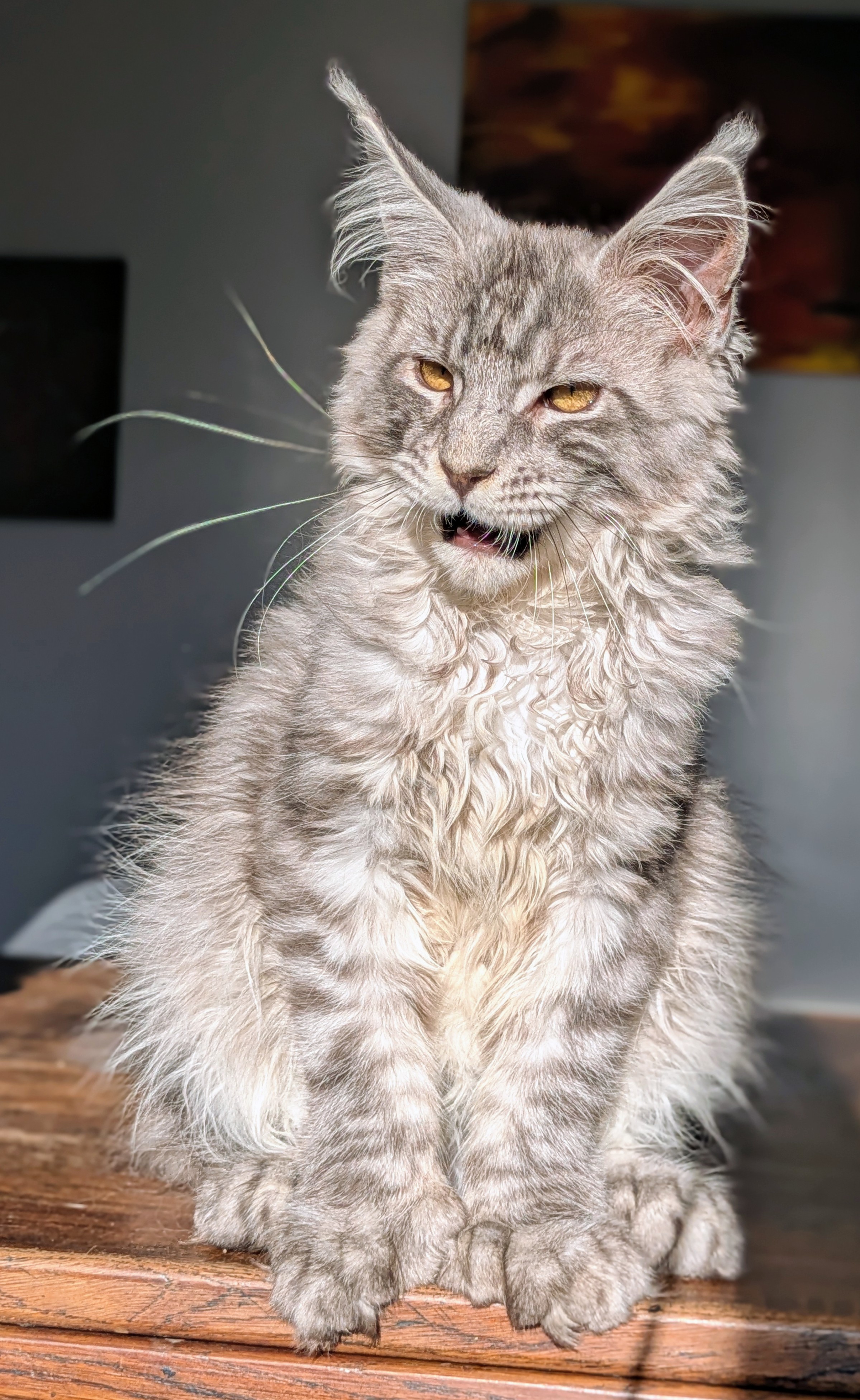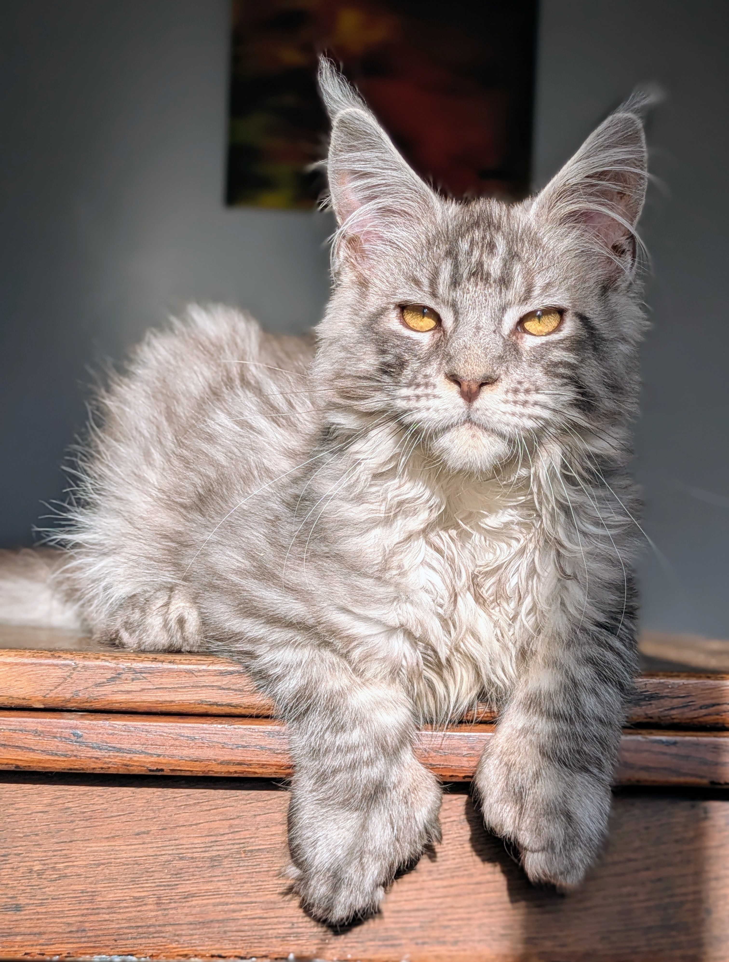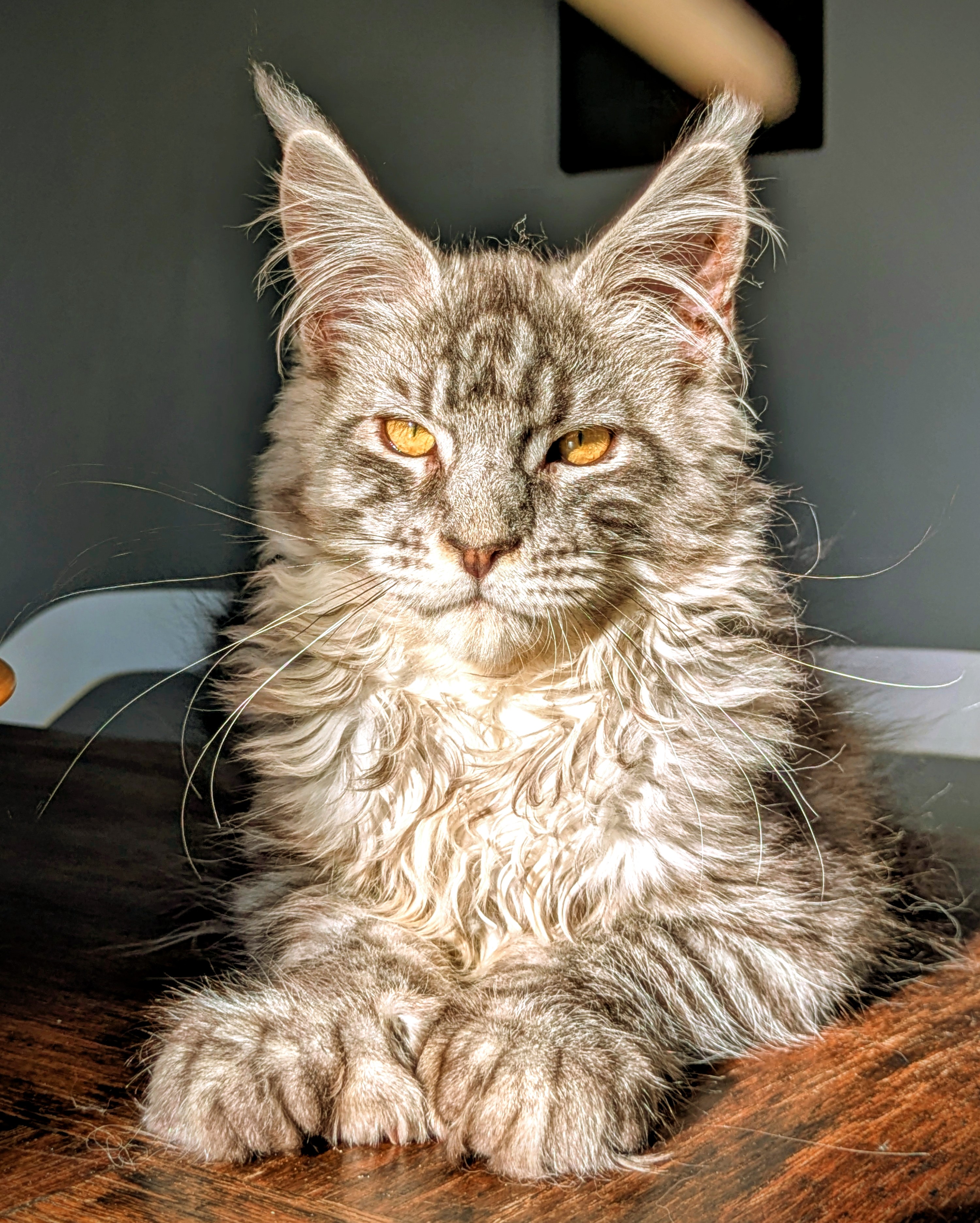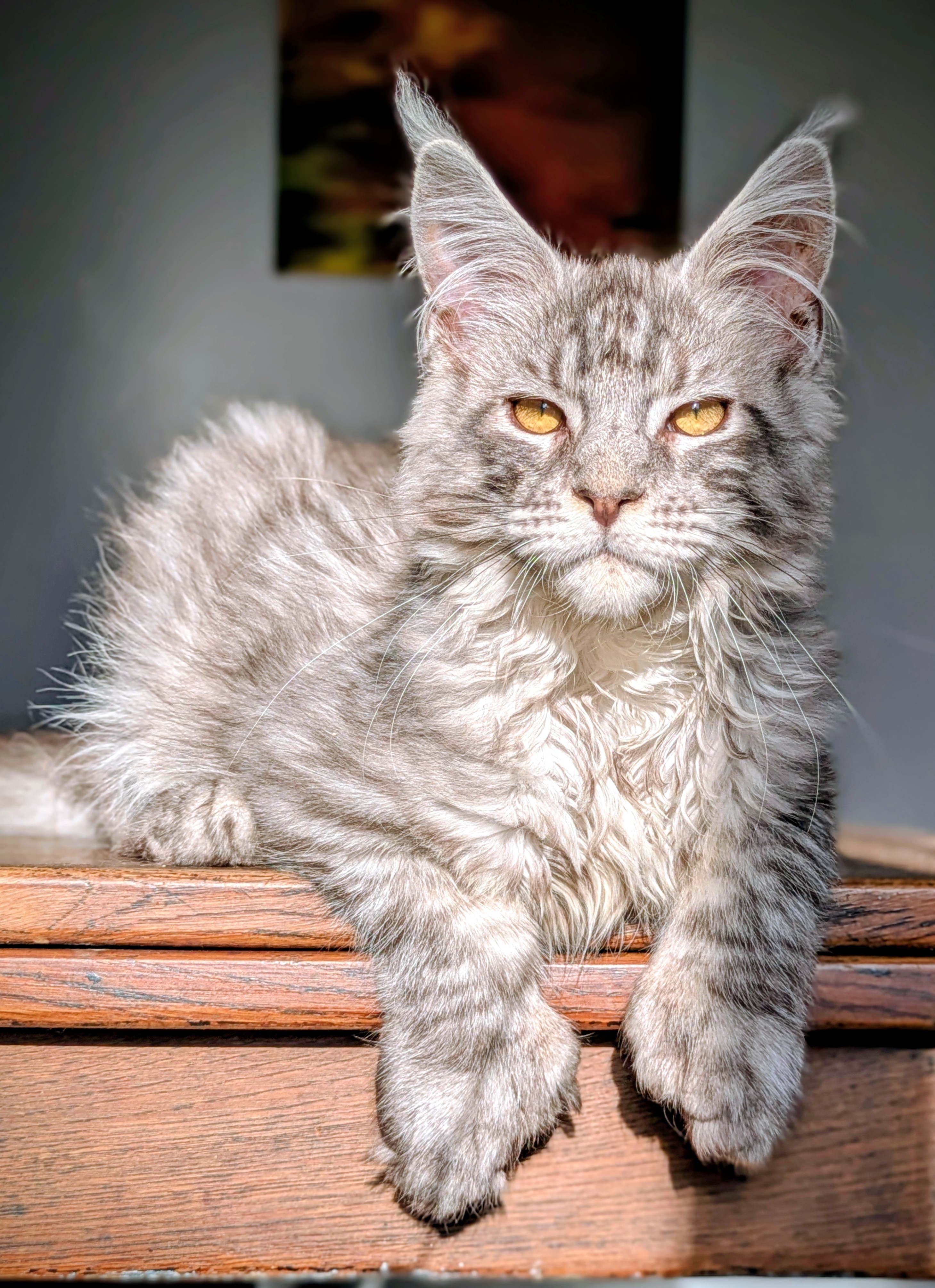 Ce jeune prince à la belle robe bleue silver mackerel tabby et grosses pattounes polydactyle a un caractère exceptionnel. Il est gentil, joueur, posé et sociable, un vrai bonheur de chaton.