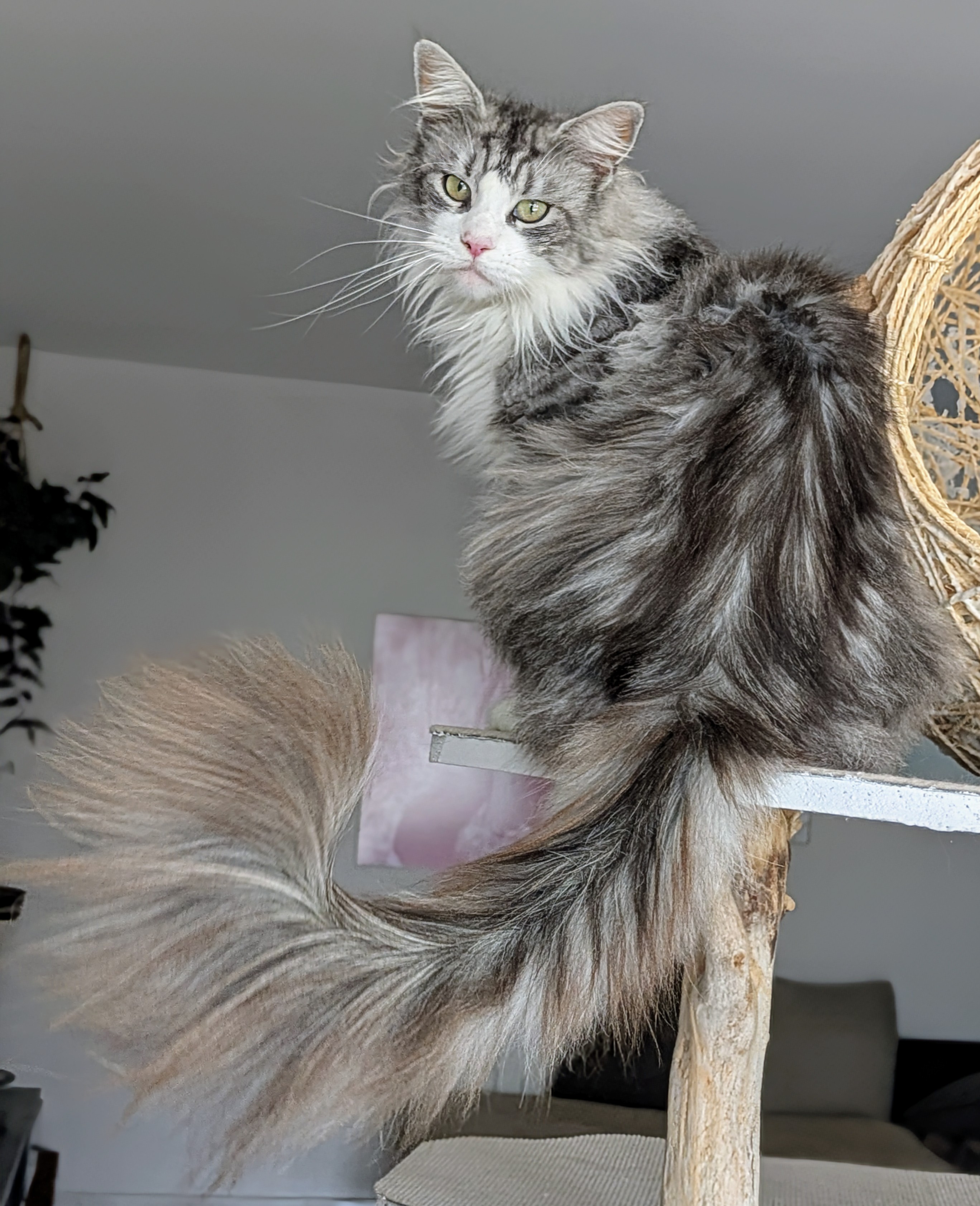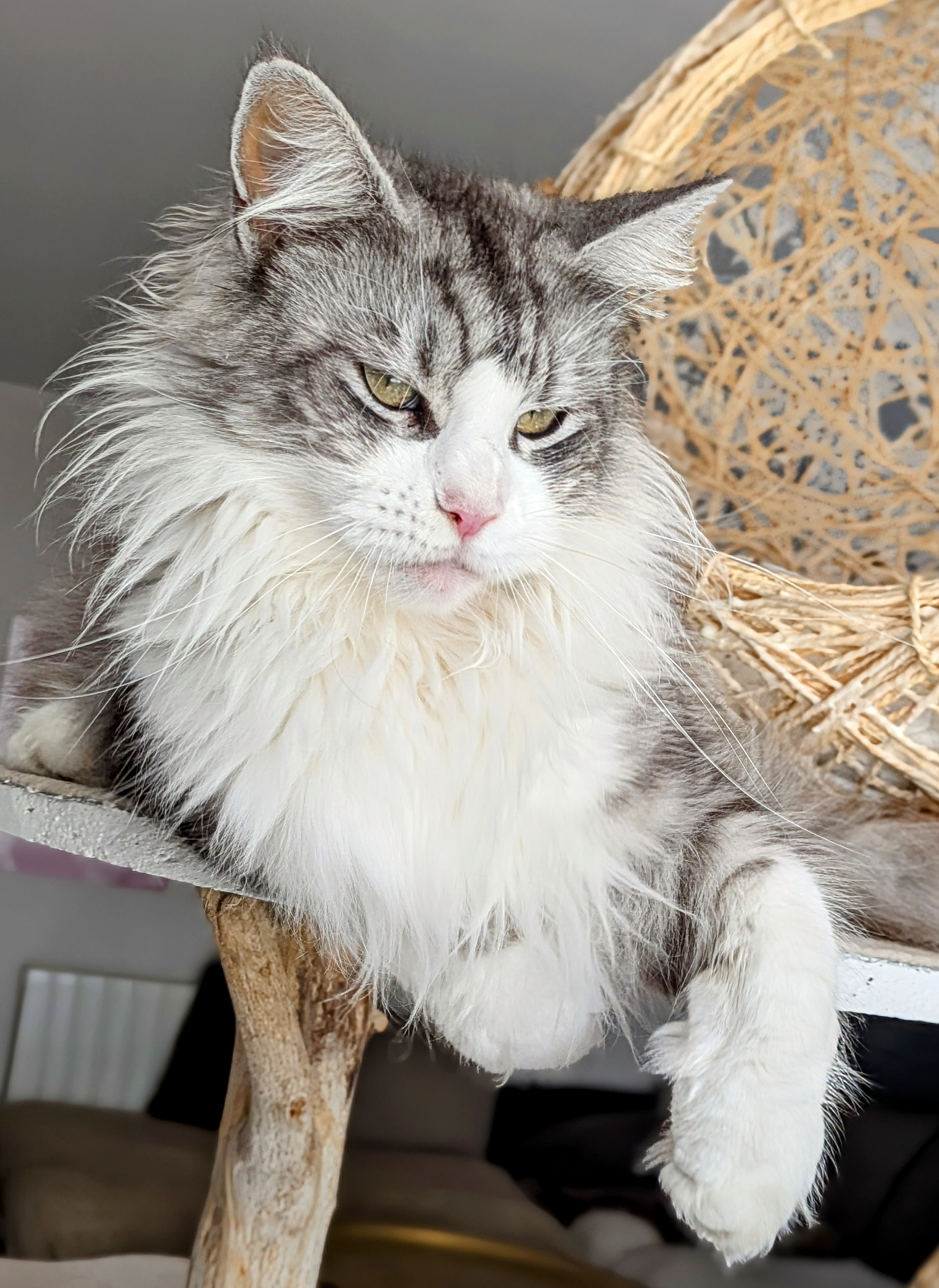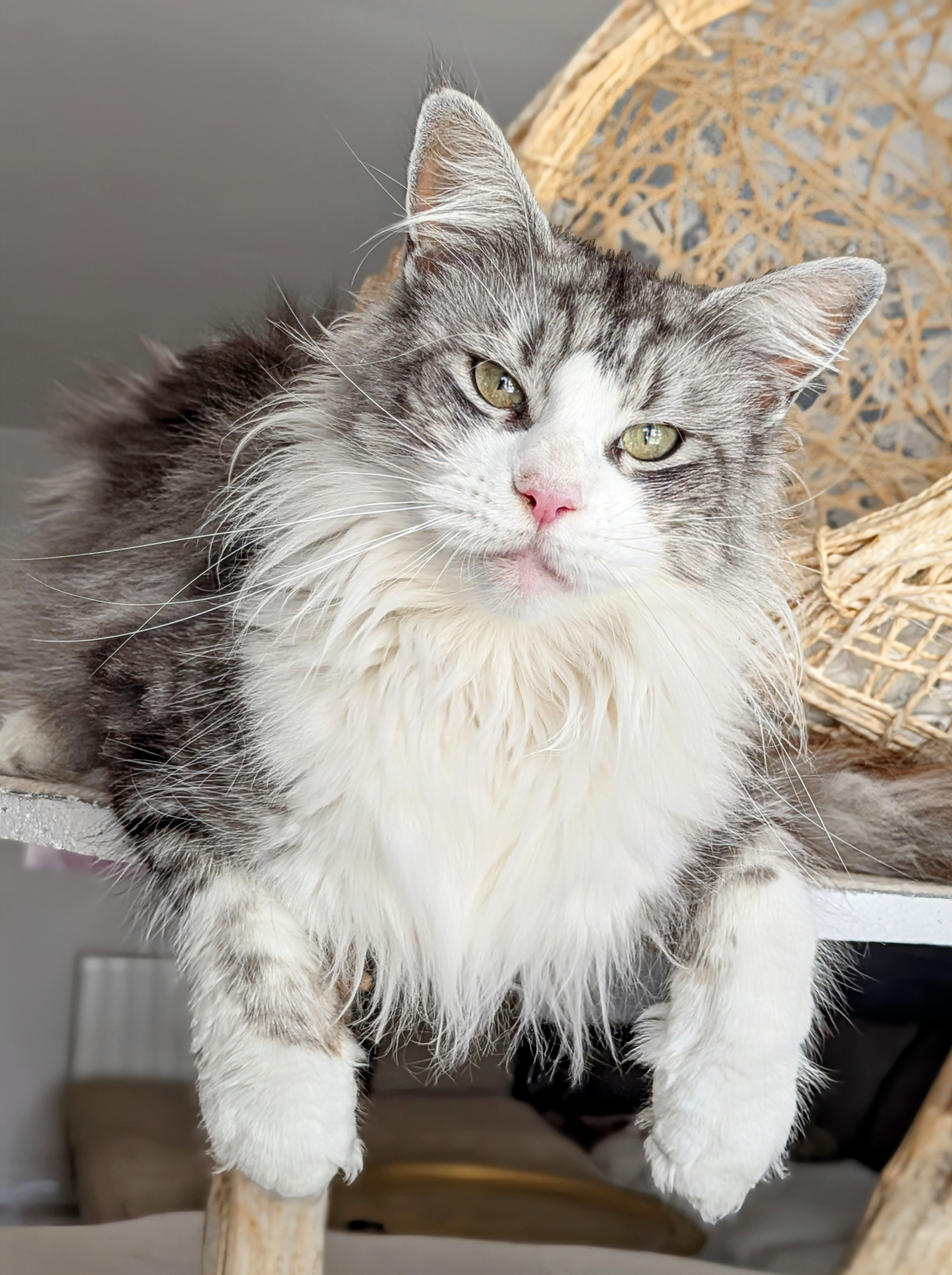 Ula-Hoop c’est notre petit chamallow ! Un caractère tout doux pour une chatte très calme et qui s’entend avec tout le monde.